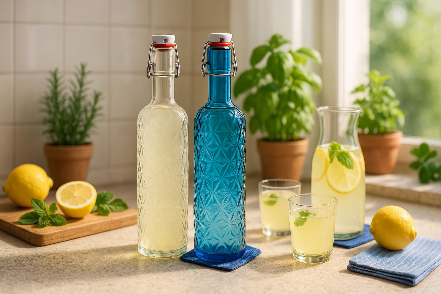 The "Oriente" series combines artistic aesthetics with functional perfection. Inspired by oriental elements, this bottle impresses with its faceted body, which elegantly captures light reflections and gives the design a luxurious depth. Available in clear and azure blue, it sets special accents and brings exoticism and elegance to any setting. The airtight swing-top closure not only ensures a secure seal but also emphasises the traditional craftsmanship embodied in this bottle.