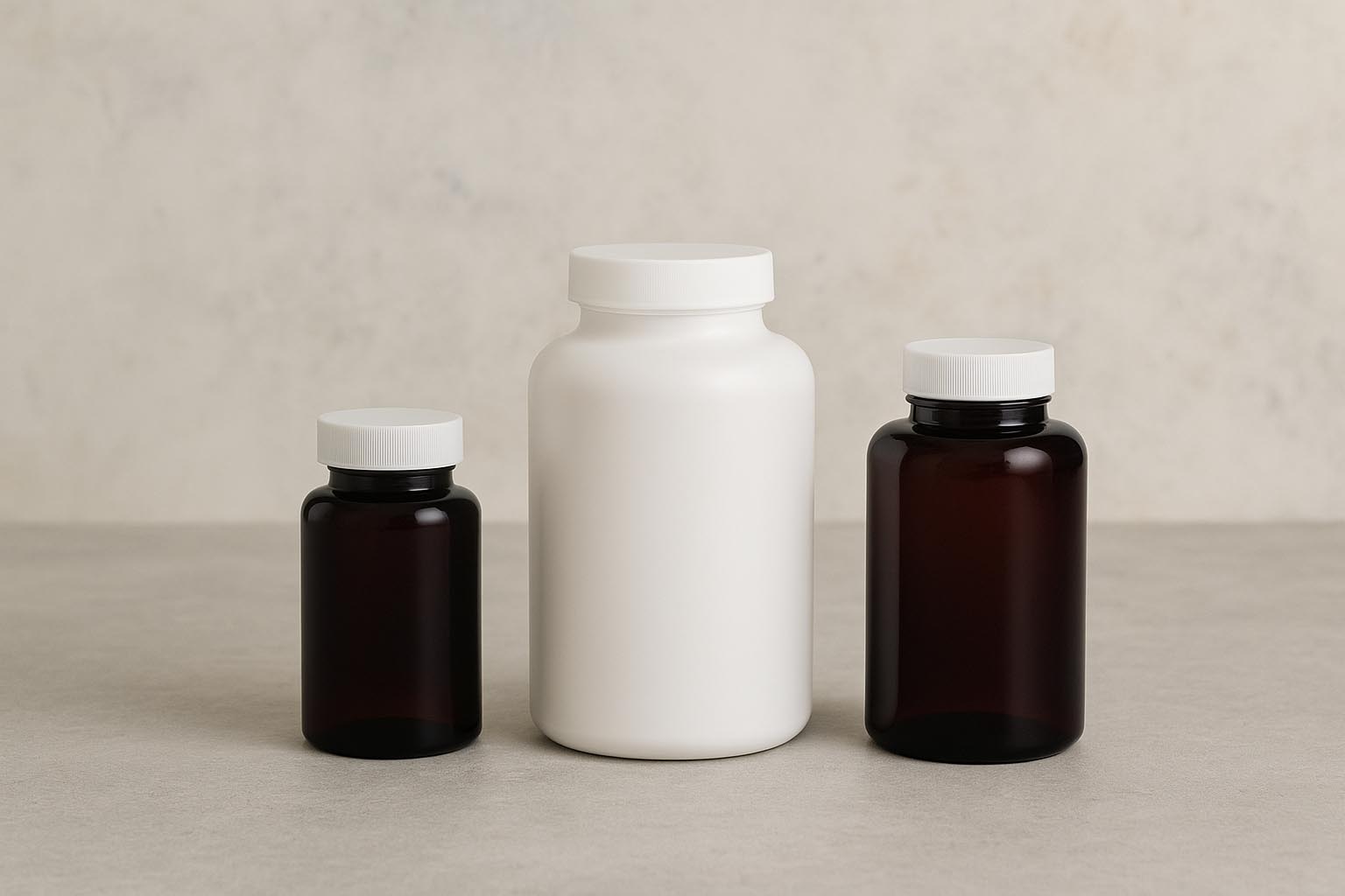 The "PET-Packer" series offers a high-quality and functional packaging solution for dietary supplements, pharmaceutical products, and cosmetic applications. Made from food-grade PET, this sturdy packer container impresses with its low weight, high break resistance, and optimal protection for tablets, powders, capsules, creams, or ointments. The round base shape ensures easy handling and space-saving storage. Available in brown and white, with a volume range from 75 to 500 ml, the "PET-Packer" adapts flexibly to various applications. The standard 38/400 neck allows for secure sealing – matching closures are available in our range. With its versatile usability and high functionality, the "PET-Packer" is the perfect choice for reliable and professional product packaging.