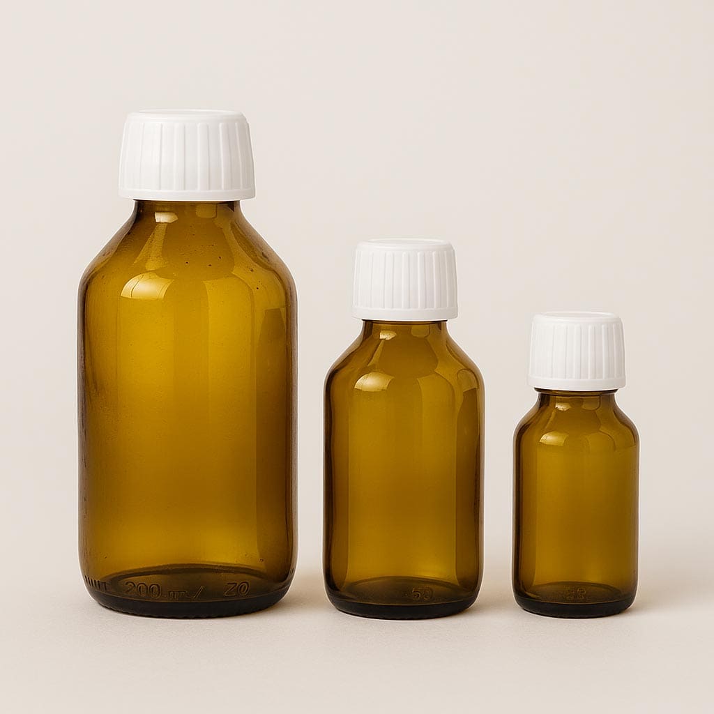 The brown medicine bottle combines functional safety with timeless design, offering an ideal solution for pharmaceutical and cosmetic products. Its round base provides a classic look and good stability, while the coloured glass ensures excellent protection from light and shields the contents from harmful external influences. With a volume range from 50 to 1000 ml, this bottle is suitable for a variety of applications. The standardised PP 28 neck allows for secure sealing and is compatible with closures from our range. This high-quality medicine bottle stands for protection, quality, and professional product presentation.