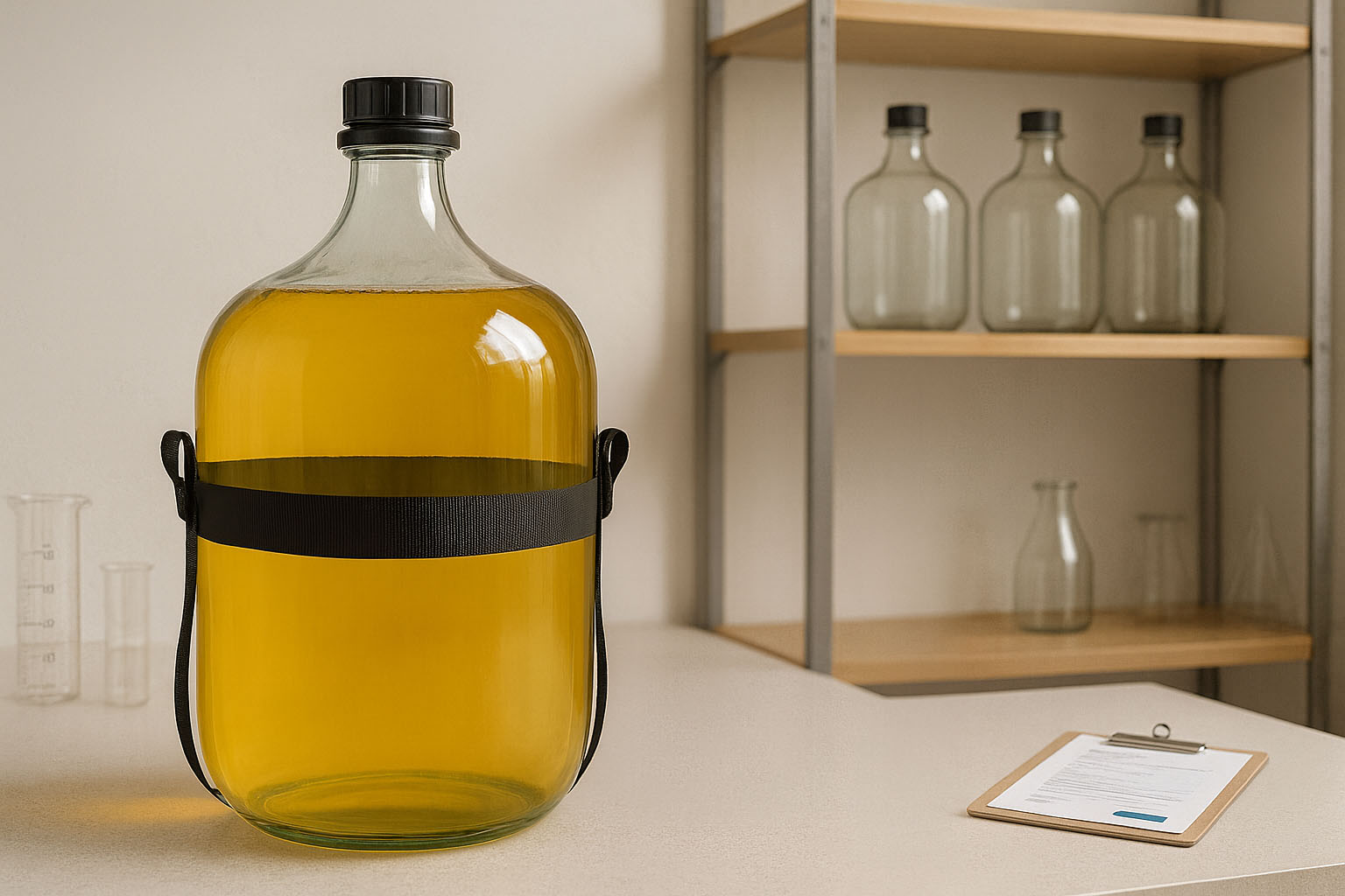The "High End" balloon bottle combines first-class workmanship with maximum safety and functionality. With its generous volume of 25 litres, it offers an ideal solution for the storage and transport of sensitive liquids. Its round shape ensures an even distribution of the contents, while the drop protection packaging with UN approval meets the highest safety standards. The black originality seal guarantees a reliable seal and protects against unauthorised access. Additionally, 48 mm wide textile straps with plastic carrying handles provide comfortable handling, even when fully loaded. Perfect for the safe storage and transport of spirits, chemicals, or other sensitive liquids – the "High End" balloon bottle sets new standards in quality and safety.