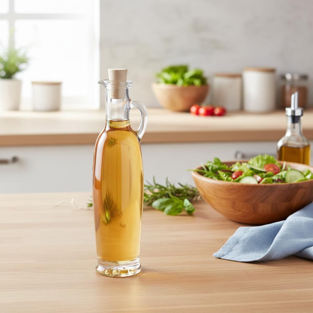 The "Spout Mouth Bottle" product series from Flaschenland includes high-quality glass containers specially designed for storing and dispensing liquids such as vinegar and oil. With their distinctive spout mouth opening and practical cork stopper, these bottles combine functionality with timeless design. The 250 ml glass bottle 'Simona' is characterised by its robust, heat- and cold-resistant glass material, which is also dishwasher-safe, microwave- and oven-proof. These versatile properties make the bottle particularly durable and easy to care for. The round shape of the container ensures comfortable handling and secure storage. The cork stopper provides a reliable seal while allowing easy dosing of the liquids.
