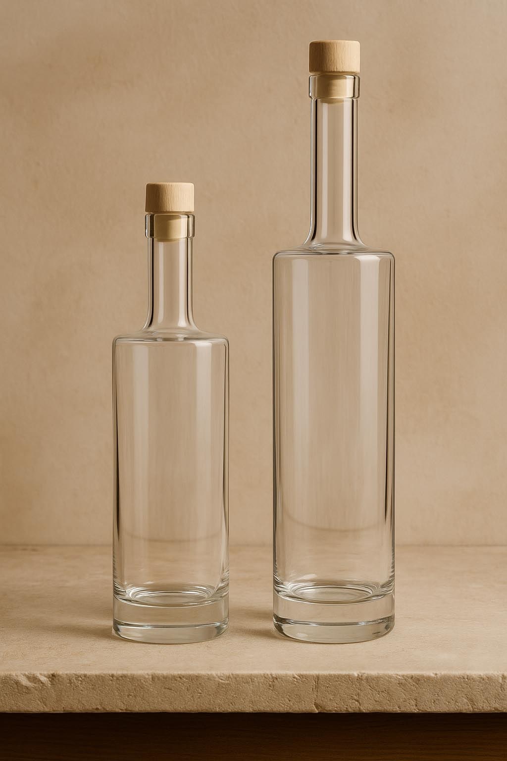 The "Titano" series combines powerful presence with refined simplicity, setting new standards in the world of premium glass packaging. This noble clear glass cylinder bottle impresses with a solid glass base that not only provides stability but also conveys visual depth and exclusivity. Available in sizes 500 and 700 ml, "Titano" is perfect for high-quality spirits, fine liqueurs, and distinctive distillates. The cork neck ensures a classic and secure seal – suitable closures are available in our range. With its robust elegance and timeless aesthetic, "Titano" is the ideal choice for discerning brands that value quality and expressiveness.