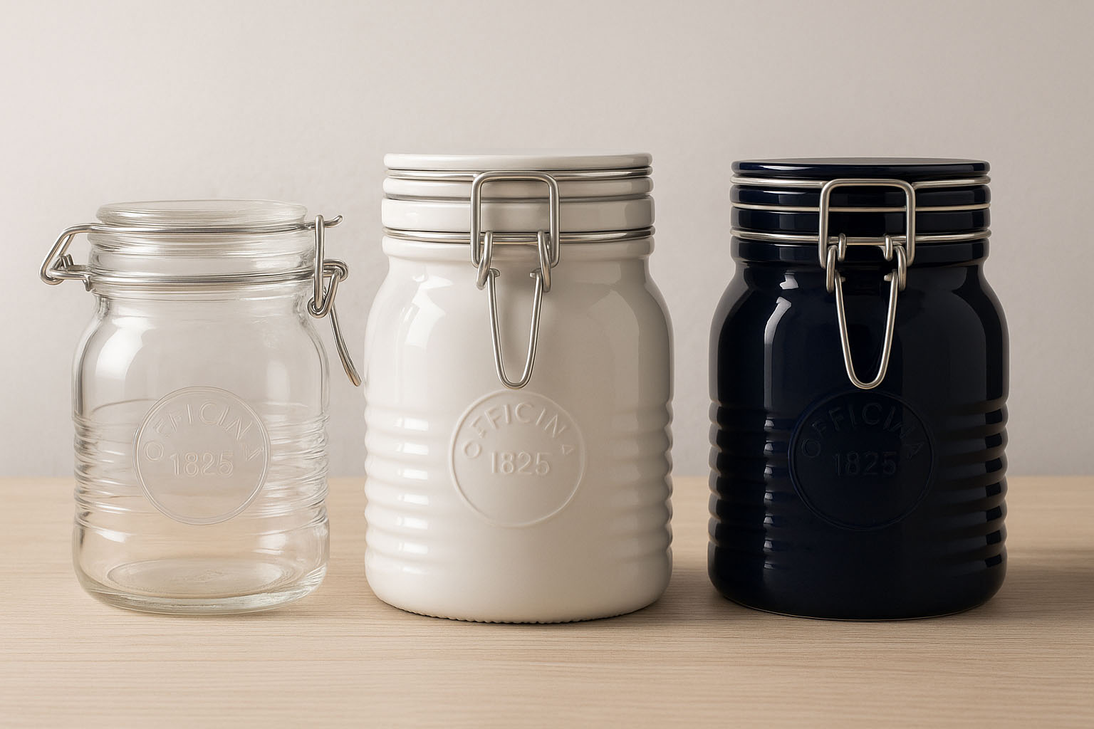 The "Officina 1825" series from the Italian manufacturer Bormioli Rocco combines high-quality craftsmanship with nostalgic charm. The distinctive design, featuring grooves along the glass rim and the embossed "1825" logo, makes each glass a true eye-catcher. These stylish wire bail jars have been specially developed for gourmet producers, hotels, and discerning private packers who value aesthetics and quality. Available in blue, red, and white as part of the special Colour series, "Officina 1825" offers an exclusive way to store fine delicacies tastefully and securely.