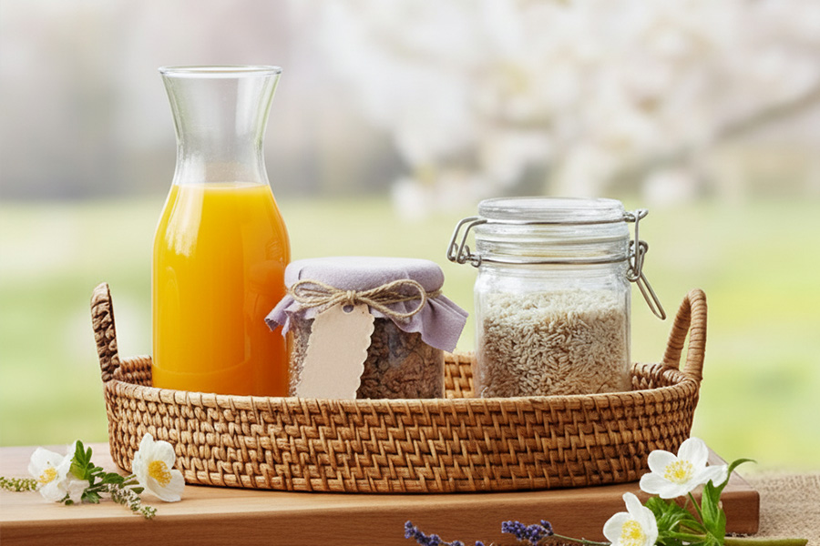One idea is the “Breakfast in the Green” theme: present jams, honey or juices in decorative jars and bottles – for example, classic honey jars, small round jars or stylish juice bottles. Add tasting spoons and small sample jars so your customers can try different varieties directly. This builds trust in the quality of your products and encourages spontaneous purchases.